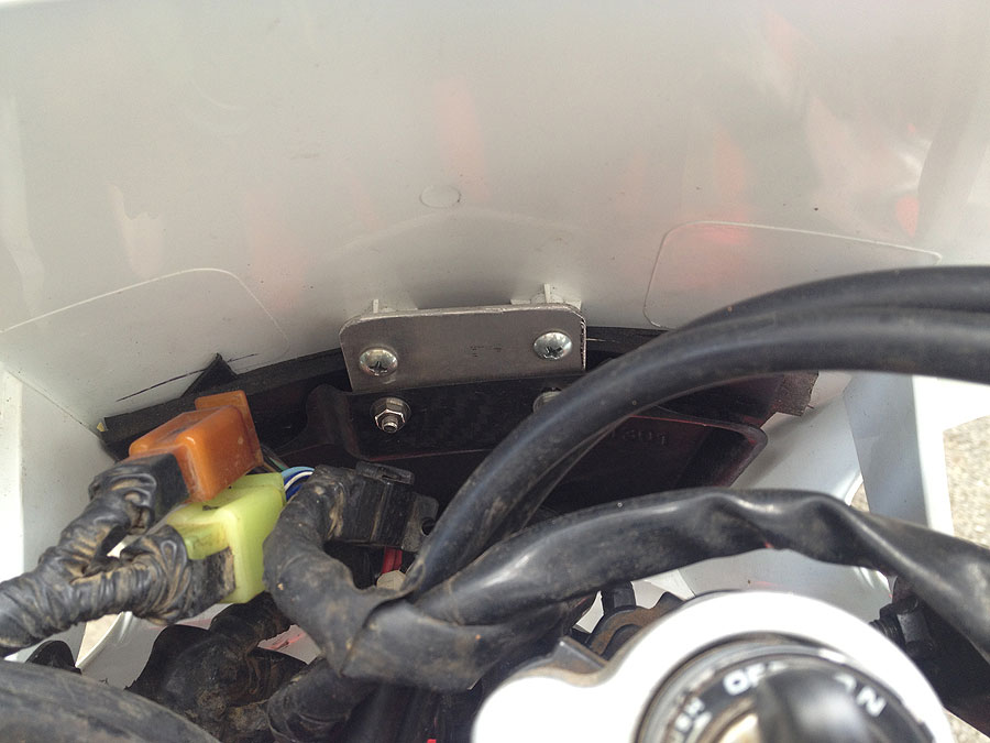 アーマーハンドガードは「レバーを折らない為に付ける」と思ってる人が多いらしいですが、実は「木にぶつかった時に手を潰さない為に付ける」が正解です。もっとも、自分は太い木が一杯生えてるところにあまり走りに行かないので、普段は付けてないのですが、うっかり木に手がぶつかったりすると痛いもんです。それでも以前はあまり付ける気にならなかったのは、転けた時にハンドガードが明後日の方向向いて、ワイヤーやホース類に干渉して走行不能になる事が多かったからなのですが、トップブリッジのアッパーボルトに直付け出来るマウントが出来てからは、かなり信頼性が高まりました。アーマーハンドガードはXR250時代の物をそのまま使うとして、マウントは新規に買いました。取り付け自体は簡単ですが、トップブリッジのアッパーボルトにはライトカウルのステーが付いていますので、その上からマウントを付ける形になります。ところがそうすると、ステーにアクセルやクラッチのワイヤーを引っかける事が出来なくなります。まぁ、出来なくても特段不都合はありません。