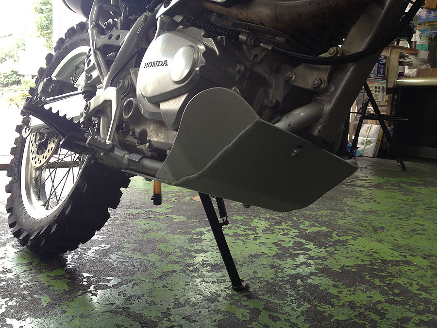 このXR230“パンツァーファウスト号”はもとよりトレール車ですので、使用目的はエンデューロやトライアルごっこ用です。その為、最初からハンドガードやアンダーガードを取り付けるつもりをしていました。当然これらの装備を付ければ更に重量大となるため、当面公道を走らない事として保安部品等は全部取り外し、出来る限り軽量化しました(といっても限度がありましたが)