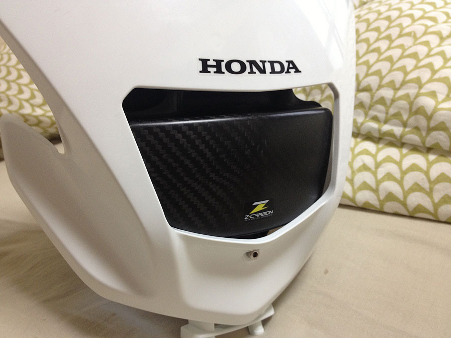 そこで見つけたのがZ-CARBONのヘッドライトエリミネーターだった訳ですが、ラインナップされていたのはCRF250/450Xの物。形が似てる(というか全く同じに見えた)から、XRのライトカウルにも入るだろうと思い買ったのですが、合わせてみるとライトの形が全然違ってて上手く入りませんでした。