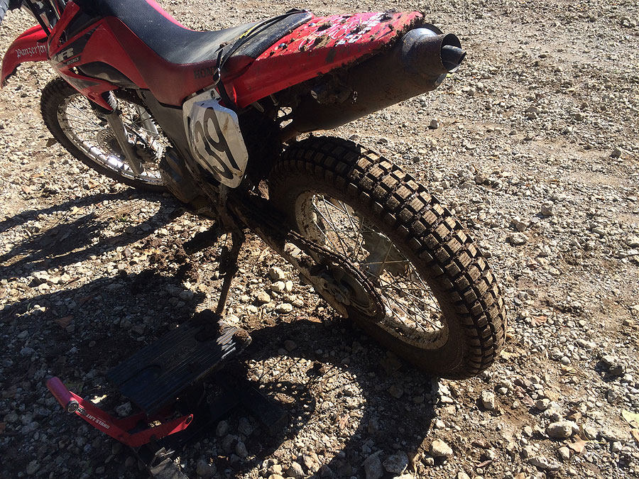 整備が済んだら、コースイン。取り敢えずコースの状態と、バイクの状態を見るために2速オートマ走法で。確かにコースは全般的に湿ってる感じで、所々グチャってる所もあり、要注意路面です。ところがバイクの方は2速ではあまりにも遅い。まぁ、フロントを10丁のトライアルスプロケに替えているので、超重低速トルク仕様にしてるからなんですが、ストレスが溜まるほど遅い。そこで2周目からは3速に上げてみたのですが、これで丁度いつもの2速オートマ走法チックな速さになりました。前回の谷田部での練習で気が付いたのは、低速重視化したXR230は3速オートマでも相当粘って走ってくれる、という事でした。普通だったら1速下げねばらない様な状況でも、そのまま頑張ってくれるのですが、頑張らせ続けるより思い切って1速下げた方が立ち上がりが早い場合がある、というのは、どんなバイクにでも共通の事象です。なので今回はその辺りも注意してシフトチェンジをする様に心掛けました。幸いに、クラッチを全取り替えしたお陰か、以前の様なシフトペダルがガチガチに固くてシフトチェンジ出来ない、なんて事もなくなり、大分言う事を聞くバイクになってきました。