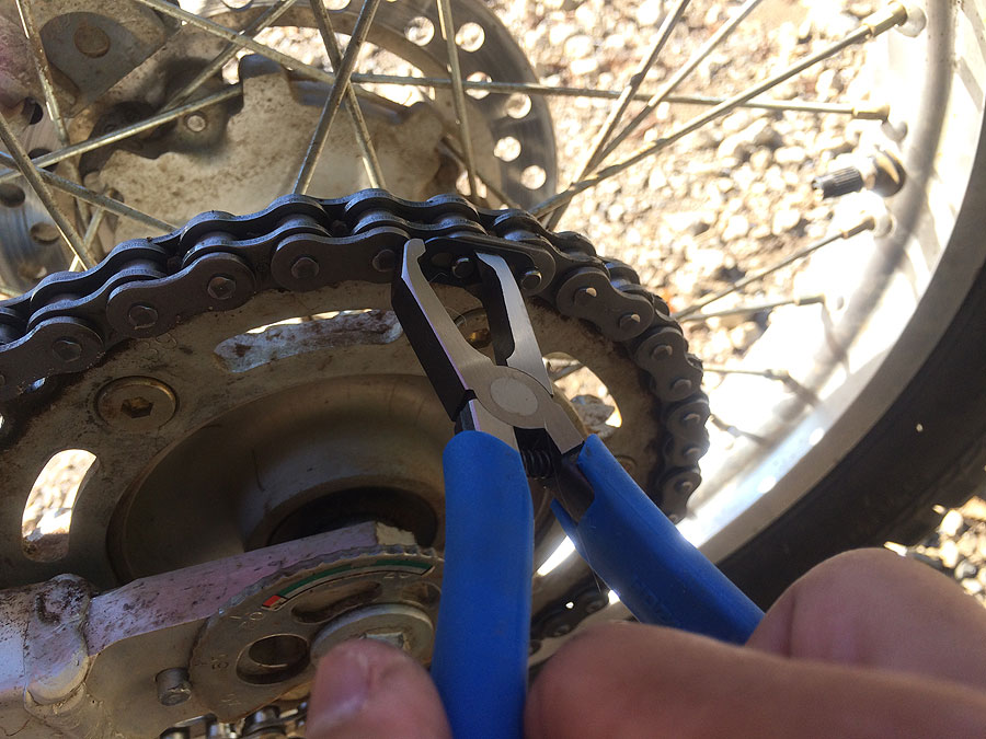今日は事前練習という事で、XRだけ乗る事にしました。CRFに乗ろうとしたらエアクリーナー付けなければならないし、終わったあと洗わねばならないので、面倒くさいからオミット。近々乗る用事があれば乗ったのですが、来月のレース終わるまではXRがメインになるので、CRF250R“モルゲンシュテルン号”はしばらくお休みです。前回乗ったあと、整備してたら雨降り出して、チェーンとかアンダーガードを付けているヒマが無かったので、まずそれらの装備から。実はこの度、ホーザンのチェーンプライヤーを買ったのですが、これが実に使いやすい。今まではただのプライヤーを使っていたのですが、付けにくいし、使っているウチに先っぽが崩れてくるし(今のは二代目)で、やってやれない事ないけどイライラする。そこで専用品を買った訳ですが、専用品だけあって実にストレス無くクリップを付けたり外したり出来ました。1700円くらいで買えるので、これは買っておいて損はありません。