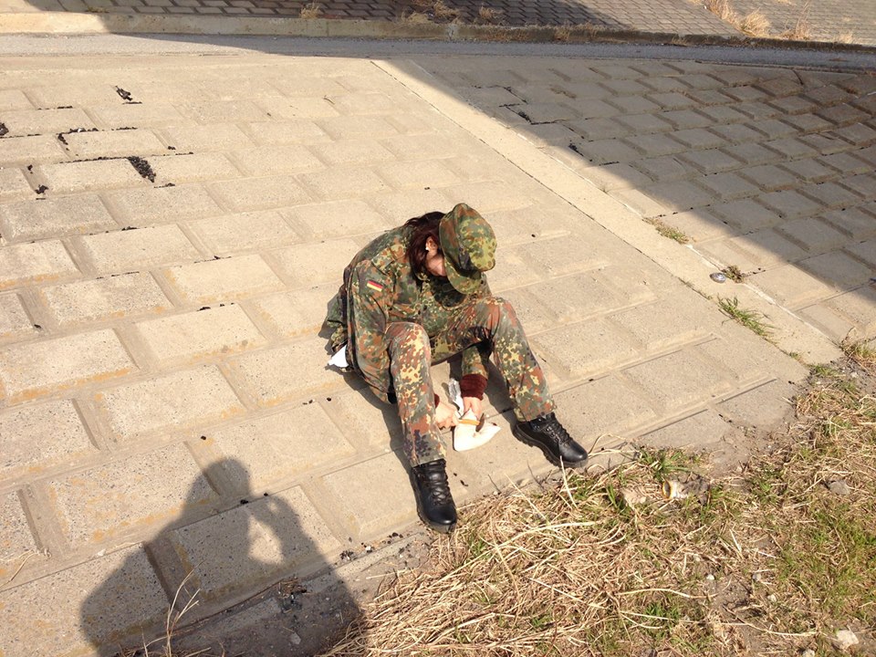 続いて、黒豆を飯盒で炒って代用コーヒーを作ろうとしたのですが、見る見るうちに飯盒の底の方の塗装が茶色く変色してきて、これはヤバいという事で作業中止。こんな事もあろうかと、自宅で豆を炒ってきたとの事で、コンクリの土手でハンマーで崩して、コーヒーを淹れてくれました。最初の一口はウッと思いましたが、意外にも黒豆風味はあまりなく、慣れてくると「黙って出されたらコーヒーと思うかもしれない味わい」に感じる様になりました。