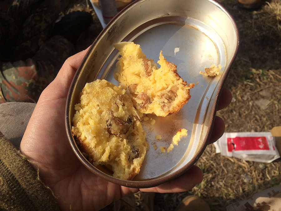 そして、先に出来た牛飯と下仁田ネギヌードルを食べてる間も飯盒ケーキを加熱し続け、コケネンがいよいよダメになってからはガスバーナーに切り替え、ようやく飯盒ケーキが完成。蓋を開けてみると、想像以上にしっかりケーキになってました。もっとも、加熱が終わったあと、膨らんでたはずのケーキが萎んでしまい、ハイジ中尉曰く失敗作との事でしたが、成功作を知らない自分らにしてみれば、十分美味しく出来ていました。出来映えとしては蒸しケーキみたいな感じでした。