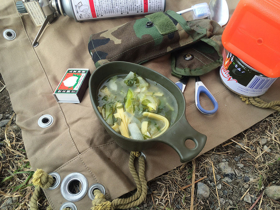 今回のオフでは、焚き火OKの場所ではありませんでしたので(といっても、誰か焚き火した跡がありましたが)、ポータブルストーブを使って調理しましたが、気候もよく風もあまりなくで、風防なしでも調理が出来てしまう好条件でした。そのため、イマイチ簡単に出来てしまってスパルタン度が低かったので、その意味での面白みはあまりなかったのですが、改めて感じたのはそれなりに人数が居るのなら、ソロ用のクッカーよりも飯盒の方がまとめて料理が出来る分、使い勝手が良いかもな、という事でした。最近のお洒落キャンパーの人たちなどは、間違っても飯盒など使ったりしないのでしょうが、やはりキャンプの一番のイメージは飯盒炊爨ですので、第2回飯盒オフに繋げて更なる飯盒復権の活動を推進していきたいと思います。