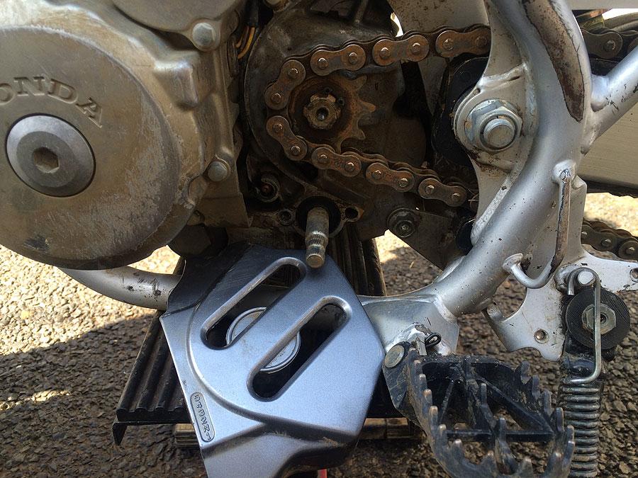 マディレースの時は、とにかく何もかもグチャグチャなので、現地ではバイクを積み込む時に身体が汚れない程度に、最低限に泥を落として、あとはプロテクターからウェアから、何でもかんでも荷室にツッコンで帰ってくる、という事になります。そして初日はプロテクターやウェアの手入れ(ウェアは外で一旦ブラシで泥を落としてから洗濯する)、次の日にバイクの洗車とトランポの荷室の掃除、という具合に、いつもの倍以上の手間が掛かります。今回、バイクを見てみると、フロントスプロケカバーの中にぎっしり土が詰まっていました。これがパワーロスの原因になっている事は間違いありません。一応、XR230の物からFTR223の穴の空いたカバーに替えているのですが、その程度の穴ではまったく効き目がない様です。そこで、XR230でレース出てる人がよくやっている様に、カバーの側面をゴロンと削る事にしました。これではカバーとしての意味があるのか?という感じですが、スプロケの歯の部分はカバー出来ているので大丈夫でしょう。