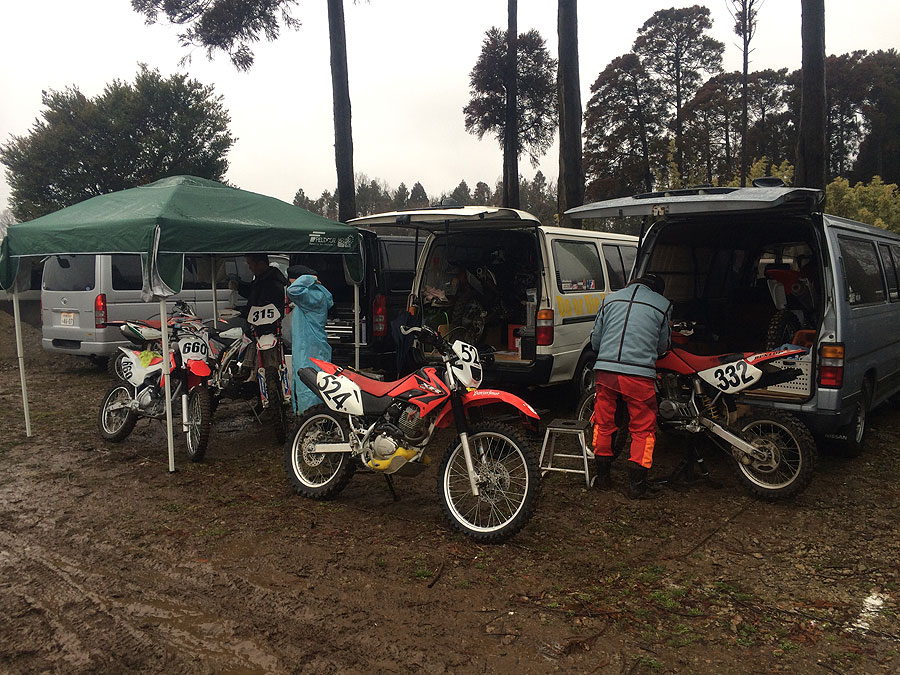 0500時起床。外を見てみると、盛大に雨が降っています。予報では雨時々曇り。普通だったらこんな日はバイク乗ろうだなんて思いません。当日エントリーのレースだったら、やはり出ないと思います。が、事前エントリーですし、他のメンバーも出ますから、自分だけ出んという訳には行きません。傘さしてトランポに向かい、勇躍、デコボコランドを目指しました。デコボコランドには0630時頃到着しましたが、すでにパドックには参加者のトランポが次々入場していました。自分たちは前日から場所取りをしていたのですが、当日やってきた人らは地面がぬかるんだトコに停めざるを得ない人もいて、大変だったと思います。
