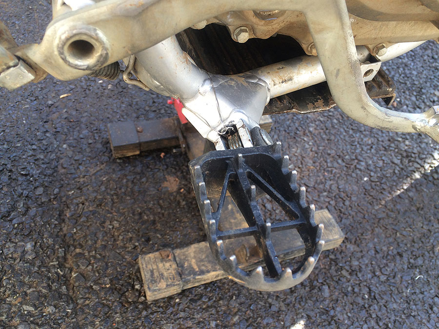 また、レース中にワダチなどを突破した際に、ステップが折れたまま土で固まってしまい、足で蹴らないと戻らない事がままあったのですが、よく観察してみると、右のステップの戻りのスプリングの爪が甘くなって外れてしまい、畳んだステップが元に戻らない様になっていました。どうやらフレーム側が削れてスプリングの爪が留らない様な感じでしたので、ワイヤリングして対策しました。