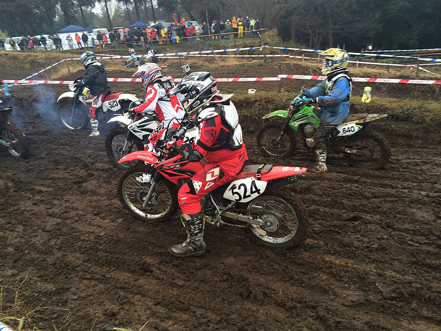 スタート位置には、クラス、ゼッケン順にコースインしていくのですが、オープンB、Cクラスが出走する時点では、自分たちテーピングクラスはまだコースの脇道で待機でした(つまりコースに入れないほどの台数が控えてる)。前から順にスタートし、やがて自分らの番も回ってきたのですが、コースは見るからに泥濘です。自分たちの前に40分クラスが走って、いつもの本コースは相当掘り返されている様でした。