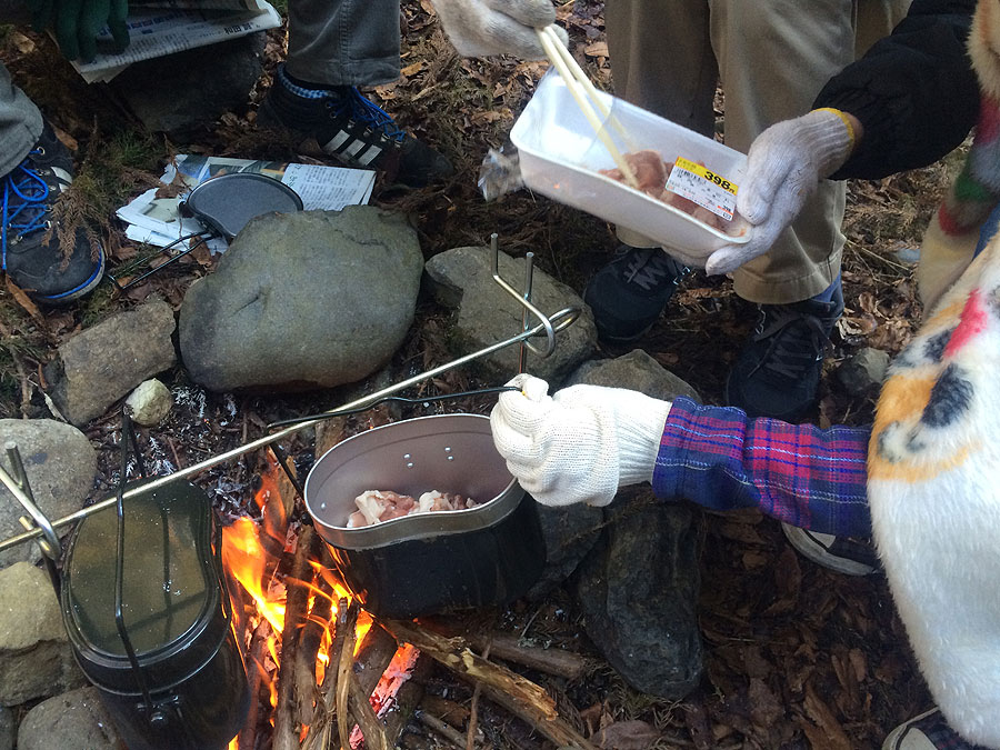 さて、下に下ったら早速カマド作りである。といっても、そこらにゴロゴロとメロン大の石が転がっているので、それを集めて円陣を組めばおしまい。簡単なものである。カマドが出来たら薪を放り込んで火入れである。予定では、クソ真面目に新聞紙や枯れた杉の葉などで火を熾すつもりでいたのだが、時間が押しているのでゲルネンを投入。ところが、予想以上に風が強くてなかなか火が着かない。何本かマッチを犠牲にしてようやく点火した。火が着いてしまえば、ゲルネンは勝手に薪に火を付けてくれるので楽勝である。火が熾きたら、年始に購入したハンゴーキャッチをプラスチックハンマーで地面に打ち込み、炊爨開始です。ところが、地面が柔らかいくせに10cmくらい下にはデカイ石があるみたいで、縦棒が結構ぐらぐらして心もとない。この状態で飯盒ぶら下げたら、うっかり縦棒が転けてエラい事になりそうなので、適当な大きさの石で棒をサンドして極力グラつかない様にしました。