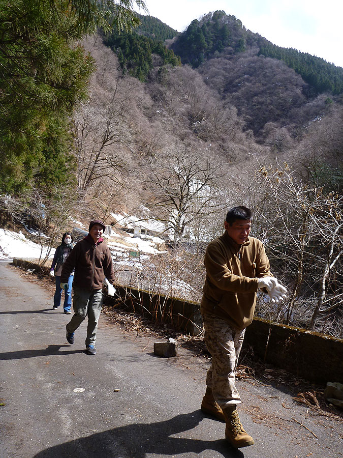 ところで、海沢渓谷は、渓谷というだけあって谷底なので、山の方は照っていても谷の方は日陰です。かつ風も強かったのですが、その上いつぞやの大雪も残っているという状態で、風が吹くと結構寒い。到着して間もなくの間は、それなり動いていたのであまり感じませんでしたが、料理が出来る頃にはあまり動かないので、風が吹くと身体が冷えてくる。自分はマイナス10度くらいまで耐えるツーリング用のジャケットを着てたので大丈夫でしたが、皆さん一様に寒そうです。特に寒がってたのは御婦人で、どうみても普段着の上からリスの絵の小さい毛布被ってる感じです。かつ、どうすれば極力体温を奪われずに済むかもご存知ない様でした。