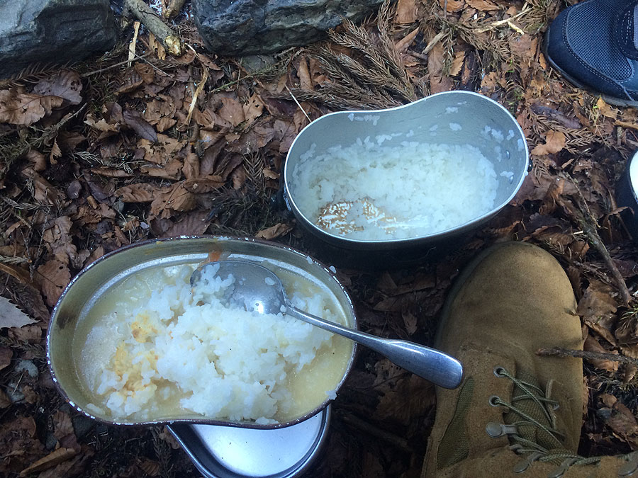 同様に、飯盒を火から下ろす時に、横棒から抜かねばならない訳ですが、些細な事ながらこれが面倒くさい。日頃、ストーブの上に置いて調理するのに慣れているせいか、本来なら飯盒は横棒にぶら下げて使うのが当然の事なのですが、横棒から外すのにストレスを感じました。特に隣の飯盒はまだ火に掛けておく必要がある時に面倒です。