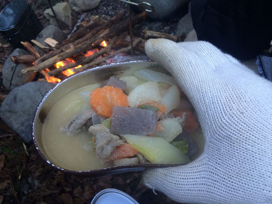 ご飯を炊いている時に蓋を取ったり、あるいは飯盒で具材を炒めたりする際に、横棒にぶら下がった状態では非常にやりにくい事が分かりました。横棒にぶら下げて炊爨する要領は、旧日本陸軍に限らず世界各国の軍隊でもやっている事ですが、基本的に蓋を取らない炊爨に適した方法であって、自分の様に始終蓋を取る人には、やりにくい装備である事がよく分かりました。