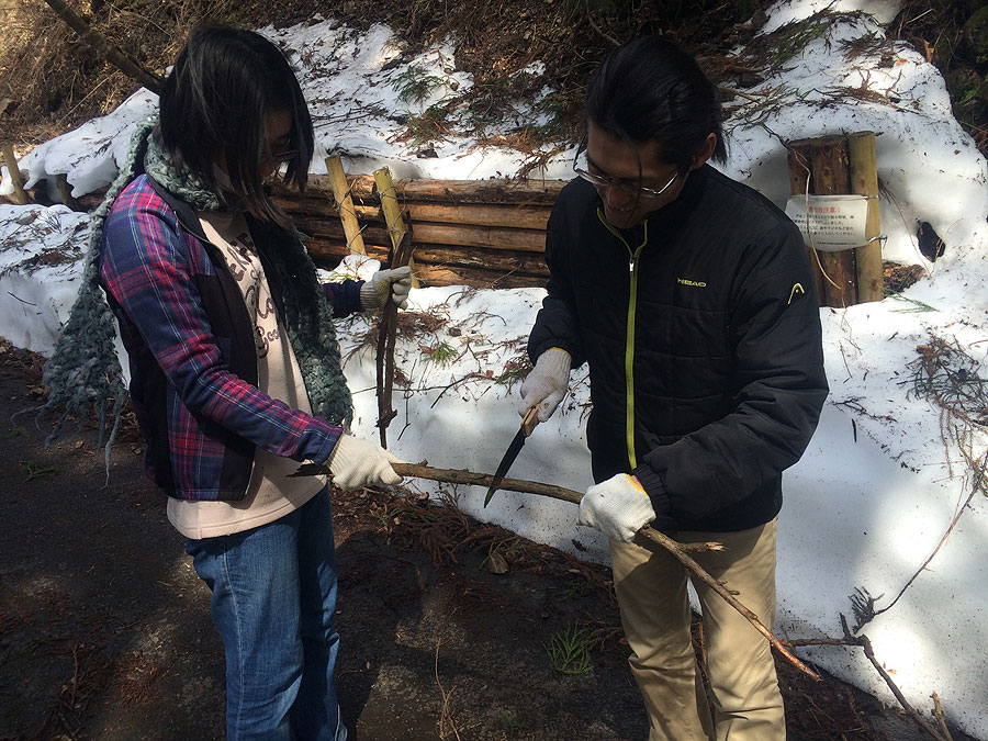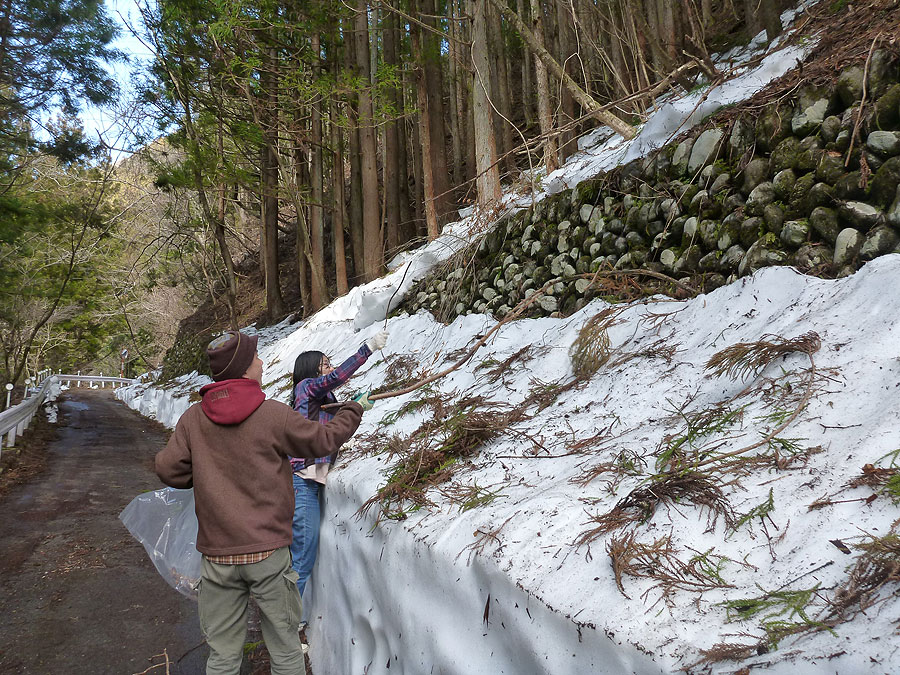 さて、首尾よく薪を調達したあと、林道を下って設営地に到着したのですが、難儀したのは渓流に降りて行く斜面。結構急なのは昔からですが、今回は大雪の影響か、杉の葉が一杯落ちていて地面が見えないのです。かつ、雪も残っている部分が結構あって、かなり足下がヤバい感じでした。とりあえず、90L袋の薪は下にぶん投げて、各自の荷物はリレー方式で下に送って、滑って落ちない様に気をつけて降下しました。