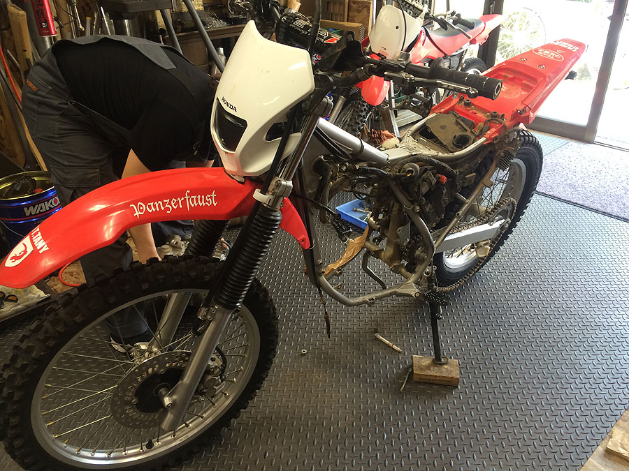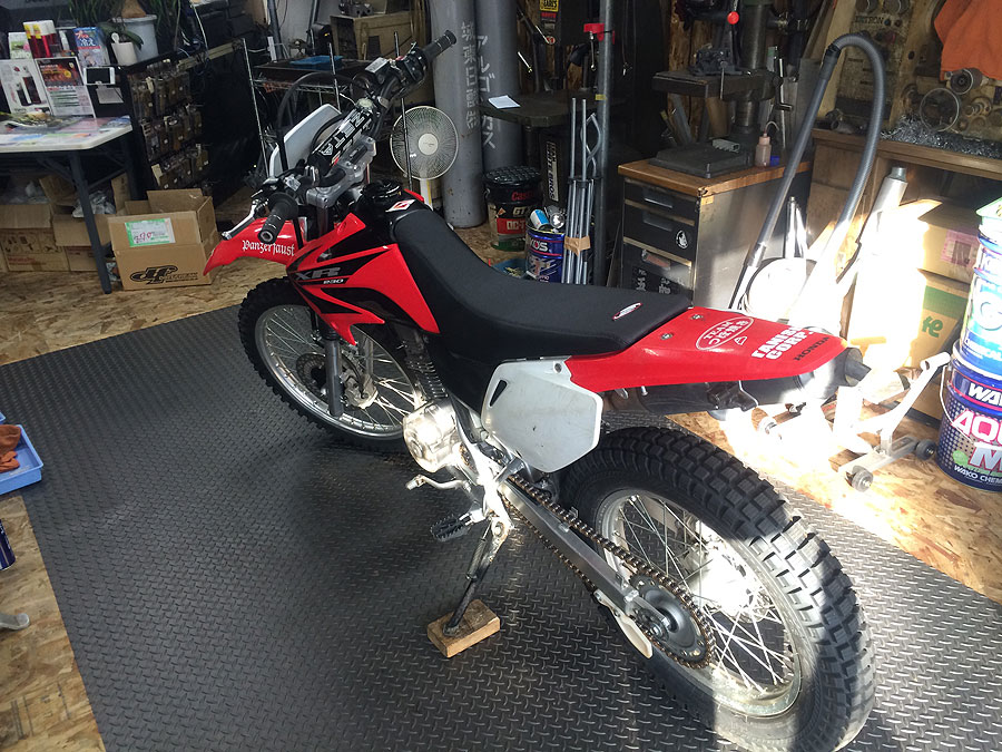 ここから先は、作業をお任せしました。急なオーダーで、かつゴールデンウィークを挟んでいたので、かなりタイトなスケジュールになったんじゃないかと思うのですが、快く引き受けて頂けました。XRがオーバーホール中は、ここんところ疎かになっていたCRF250R“モルゲンシュテルン号”の方を徹底して乗りました。同時に、オイルをホンダG3からシルコリンPro4に切り替えて、性能試験もやってましたが、結論としては安いオイルを頻繁に替えるより、高い高性能オイルを使った方がライフも長く初期性能も高く、結果的に経済的である、という結論になりました。さて、今回XRをオーバーホールするにあたって、色々相談に乗って貰ったのですが、印象深かったのは、「必ずしも頻繁に買い替える必要はない」という話しでした。これまでの自分の認識では、「モトクロッサーなどは2年も乗ればあっちこっちガタが来て、修繕しても新車ほど良くはならないんだから、買い替えた方が良い」というものでした。しかし、「それでは車体に慣れた頃に手放して、また新しいバイクに慣れなければならなくなる」との事でした。まぁ、1年そこらで乗り潰してしまうプロライダーならともかく、ファンライドで乗ってる分にはそこまで使ってないし、もったいないとの事。それなら、定期的な整備はオーバーホールで乗り続けた方が経済的だし、慣れたバイクで頑張れるとの事でした。
