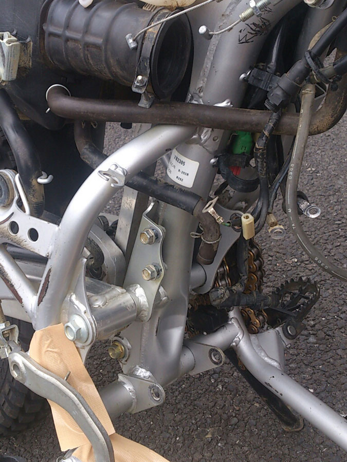 予め余計な物、アンダーガードやハンドガード、スタックベルトなどは取り外し、洗車して出来る限りキレイにしてお店に搬入しました。エンジン下ろして腰上開けるところまで見学したい、という事で、バリバリと作業を進めてもらいました。まず、サイドカバーやらシートやらタンクやらを外したのですが、シートの下が汚い。去年の夏にエアクリーナーのフィルターを交換して以来、シートは外してないのですが、その間何度もマディレースに出てますので、それで泥水が入りんだ様です。シート外すのにサイドカバーまで外さねばならない事、乾式のエアクリーナーなのでフィルタを早々替えずに済む事から、シート外すのも面倒なら外さなくても良い様な仕様ですが、オンロード走ってる分にはそれで良くても、オフではそれだとダメな様です。