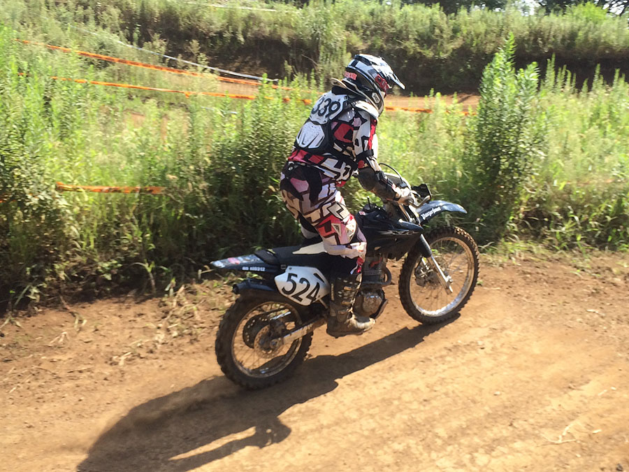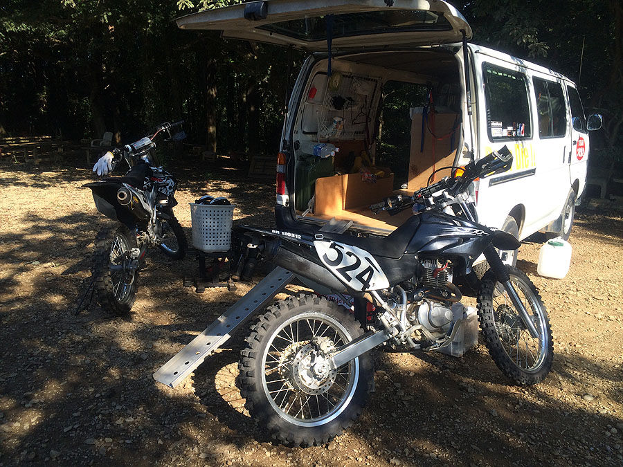 この後も、ウッズコースを走ったりしてたのですが、のべ時間で40分くらいしか走ってないのに、結構疲れる。熱中症的な疲れではなくて、肉体的な疲れです。やっぱり120kg近いバイクを起こして、向き変えてってのは、結構しんどいものだと思いました。しかも、一旦転けるとキャブがオーバーフローするので、いくらセルといえども再始動に時間が掛かるのが難点です。その意味で、早さ以上に転けない事の方が大事なバイクです。今回走ってて感じたのは、やはりタイヤはAC10ではダメだな、という事でした。ダメだも何も、今時AC10使ってるのは自走の人くらいなものだと思うのですが、何がダメといっても、よく言われる様に横滑りする事です。ちょっと車体が傾いててクラッチが切れてたりすると、ずるっと来る。正味、心許ないなぁと感じました(今更ですがw)。もし、お金に余裕があるのなら、最近流行のタイヤに履き替えさせたいところです。