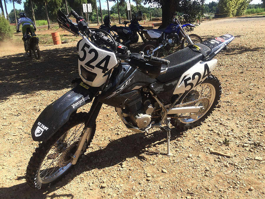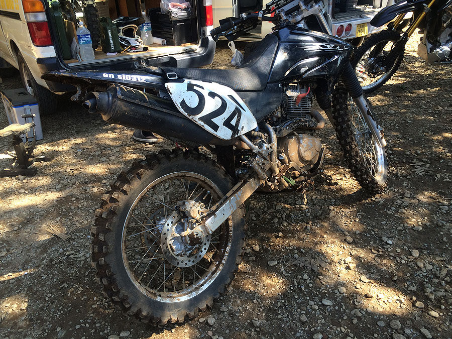 そして突入した訳ですが、案の定、フロントから引っかかりました。ここで前のXRなら、半クラ使いまくってクラッチ焼いて終了コースですが、XR230“パンツァーファウスト号”はクラッチをいじってあります。アクセルをある程度開けて、クラッチを一気に繋げば、ポーンとフロントが浮く仕様です。試しにやってみたら、前だったらなかなかつっかかって乗り越えられなかったであろう根っこの掘れた所が、それほどしんどい思いをせずに乗り越えられました。