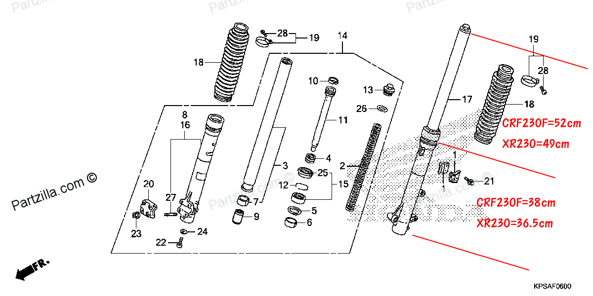 そんな事よりも、もっと大事なのは、サスの強化をどうするか、です。一番手っ取り早そうなのは、CRF230Fのフロントフォークに換えてしまうという事でしょうが、これはこれで結構なお金が掛かります。実車でどの程度違うか試しましたが、まぁ、XR230よりはちょっと強いかな?という感じでした。チューブが長い分、底付きしにくいかも。足長加工をした今となっては、フォークの換装をするのはチト抵抗があります。