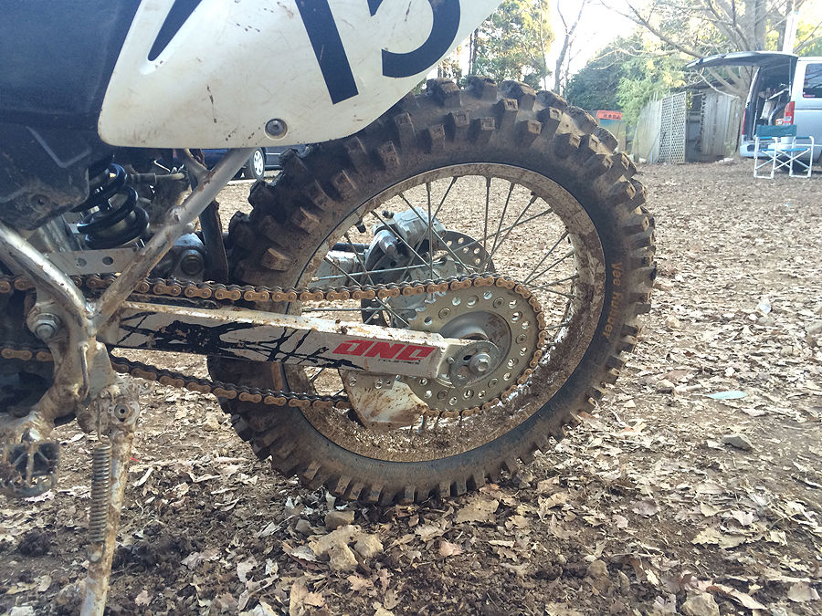 タイヤは長い間、ミシュランのAC10を愛用してたのですが、それが特別性能が良いから付けてたのではなくて、他に良いタイヤがあるってのをあまり知らなくて、なんとなく付けてるという感じでした。そして今回、初めてVee Rubberのタイヤを使ってみました。フロントがVRM-211R、リアがVRM-300です。体感的な感想をいうと、湿った土やニュルっとしたとこでも、噂どおりかなり粘っこくグリップする感じです。ウッズであまり嫌な思いをしなかったのは、このタイヤのお陰かもしれません。