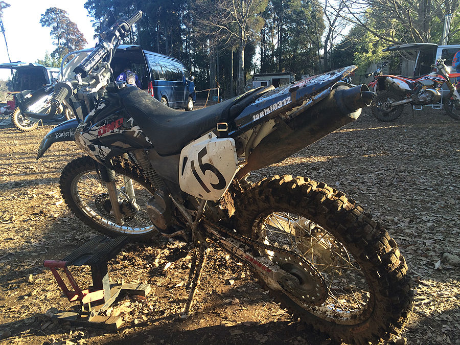 午後になってから、さらに走り込みを続けたのですが、そこで感じたのは、XR230はサスが弱いという風に常々感じる訳ですが、弱さを感じるのはジャンプの着地の時よりも、ウッズなどのギャップのある地形でシッティングで走っている時でした。ジャンプはその気になれば、前以上に飛ぶ様になったのですが(これは相対的に出力が上がった感じ)、着地の姿勢さえ間違わなければ、サスが底突く様な感じがありませんでした(そんな大きなジャンプは飛べませんし)。サスの弱さを感じるのは、例えばコーナーの立ち上がりで掘れたアクセルギャップがあったりする場面で、シッティングからいきなりスタンディングに移行できない様な時、どうしてもギャップの中を抜けなければなりませんが、そういう時に前後サスともドッタンバッタンとしてしまいます。そして時と場合によっては、サスが底突く訳です。