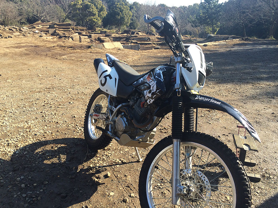今日の練習の目的は、とにかくほぼ1年ぶりの再開なので、以前やった事を一通りやってみて、何が出来て何が出来ないのが試してみる、という事にしました。取りあえず、まずコースをざっと歩いてみたのですが、陽のあたる場所はおおよそ乾いてて問題なし、林の方は雨の影響でシケシケしてましたが、トレール車で行ける範囲は大丈夫そうです。XR230“パンツァーファウスト号”のエンジンの始動は、前回チョークレバーの上げ下げで勘違いをしててスッタモンダしましたが、今回はちゃんとレバーを上げてチョークを入れて始動しました。もちろん一発でエンジンが掛かったのですが、すこしアクセルをアオリ気味にしないとエンジンが止まりそうです。XR230のエンジンは暖まった状態でチョークを入れるとエンジンが止まってしまうので、もしかしたらもうエンジンが暖まったのかと思い、チョークを切ってみましたが、するとエンジンが止まってしまう。上げても下げても止まるので、しばらくアクセルをアオリ気味にして暖気しました。2分ほどアオッておくと、あとは勝手に暖気する様です。