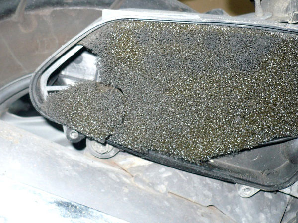 仕方なくアドレスを預けて電車で出勤した(その週は雨続きでずっと電車通勤だった)数時間後、社長さんからメール到着。なんと、エアフィルターがボロちくなって、ちぎれたスポンジがキャブレターに入ったみたい、との事でした。それじゃぁ、エンジン掛かる訳ありません。放っておく訳にも行かないので、必要な修理を依頼しました。そのあと、さらに写真が届いて、ちぎれたスポンジがキャブに貼り付いている様子が送られてきました。この様子なら、キャブをオーバーホールして貰って、エアフィルターを替えて貰えば大丈夫そうです。走行距離は1.2万kmくらいなのですが、大体1万kmくらいで一旦点検して貰った方が良いかもしれません。■その他の整備