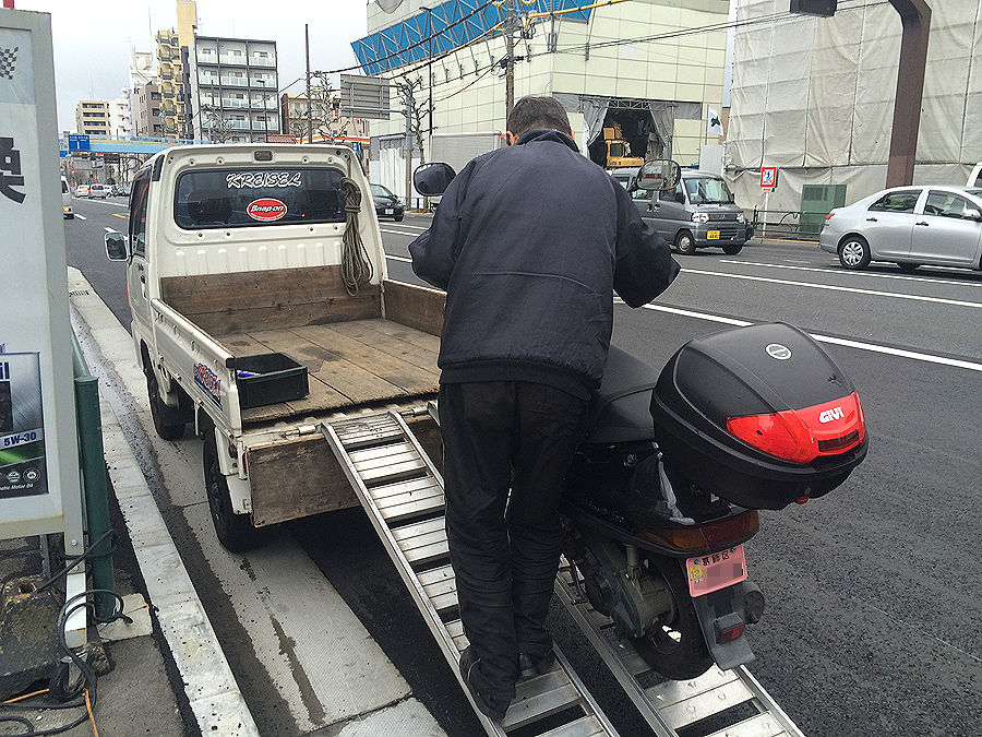 そんな折り、先日の3月10日、通勤途中にいきなりガス欠で止まってしまい、幸いにも反対車線にガソリンスタンドがあったので急いで給油したものの、エンジンが掛からなくなってしまいました。セルは回る、キックも正常、でもエンジン掛からない。あまり無茶してら、バッテリー上がったり、怪しかったキックがおかしくなっても困るので、素直に職場に送れる旨を電話して、クライゼルにSOS発信。幸い社長さんが駆けつけてくれる事になりました。