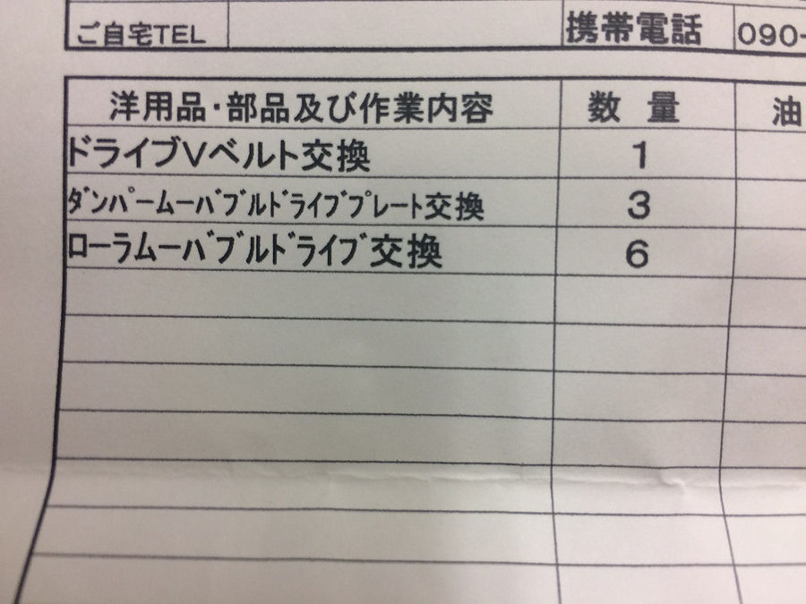 金曜日に引き取りに行った時、試乗した社長さんから、ドライブベルトがヤバそう、と言われました。既に3万強のお金を使っていたので、結構厳しかったのですが、忠告聞かずに初代は壊してしまったので、新しく買うつもりのチェストプロテクター代を使って直してもらう事にしました。で、直してもらったのですが、予想通り、ドライブベルトは一部が剥離しかけ。それ以上に酷かったのは、ローラームーバルブドライブという6個のコマで、樹脂のカラーがすり減ってもう少しで破断しかけでした。どうもキックを踏んだ時に、カラカラ音がしてたのは、これのせいでもあった様です。このカラーが減ると、ベルトがショート気味になってしまうとか。それで最近、いくらアクセル開けてもトロい加速しかしなかったのかもしれません。