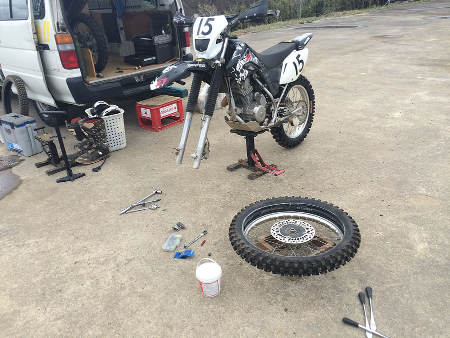 天気は金曜日の夕方から雨が降り出し、こりゃコースもエライ事になってるだろうけど、もっと困ったのが雨の中では作業が出来ないという事。というのは、バイクのタイヤがまだ前がトラタイヤで、これをエンデューロタイヤに交換する作業が残っていたのですが、予報では土曜日の昼過ぎまで雨という事でしたので、作業が出来るか微妙なところでした(最悪、トランポのハッチバックドアの下でやる事も考えました)その様な訳で、土曜日の午前はゆっくり寝て、1000時頃からのんびり出発。出発時は雨が降ってましたが、昼を過ぎる頃には上がり始め、1330時ころBTC市貝に着いた時にはパドックの地面が完全に乾いていました。久々に先生に挨拶を済ませたあと、ただちにバイクを下ろして作業を開始。リアの時はちょっと苦労しましたが、フロントはチャッチャと交換出来ました。