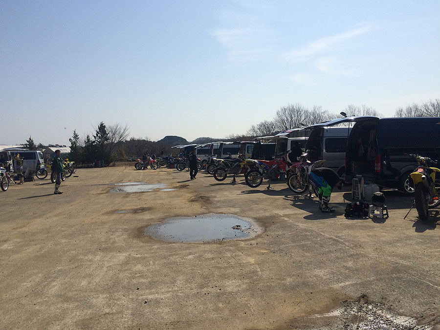 明けて当日。朝からピーカンのいい天気です。路面のコンディションはどんどん良くなる、との事でしたが、確かに試走にいったバイクについた泥は、昨日の半分以下です。しかし、前半戦は以前フカフカしてるでしょうし、後半戦も路面が荒れてかえって走りにくくなっているかもしれません。そんな訳で、空気圧は昨日のまま、チェーンの張りを直して多少緩めました。他の人とダラダラ雑談している間に、開会式が始まり、先生からあれこれ注意事項を聞いたあと、いよいよ下見ラップ。昨日、試走しているのでコースは頭に入っていますので、気持ちに余裕をもって入る事が出来ます。とりあえず、早い人にはどんどん先に行ってもらって、マイペースで下見ラップ。確かに昨日に比べたらコンディションは良くなっている様で、昨日ほどグリップの悪さを感じません。難しい、というか疲れるのは、獣道の先のズルズルの左コーナー上り、ロックセクション前後のヌタヌタ、桑畑コースのヌタ場の3ヶ所だけで、あとはむしろ昨日より走るのが楽しい感じでした。