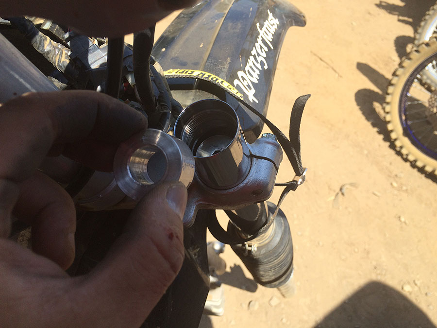 お昼に振る舞われた赤飯を食べようと箸をつけたところで、バイク屋さんから電話が入りました。曰く、カラーとスプリングの間に入ってるワッシャーを抜け、との事。何でもワッシャの穴が小さくて、エアの通りが悪くなって、エアダンパーが効かない状態になっているとの事。それで手にくる衝撃が大きくなっているらしいです。午前中から3回もフロントホイールを外したり付けたりしてるので、いい加減くたびれてたのですが、せっかくのアドバイスです。4度バラして、キャップを外してワッシャーを抜きました。このワッシャーは、アルミのカラーが鉄のスプリングで削れないための物だと思うのですが、確かに真ん中に6mmほどの穴が開いてます。しかし、まったく穴開いて無い訳でもないのに、これではエアの通りが悪いそうです。ともあれ、キャップを締めて、突き出し量は10mmに戻して走ってみました。