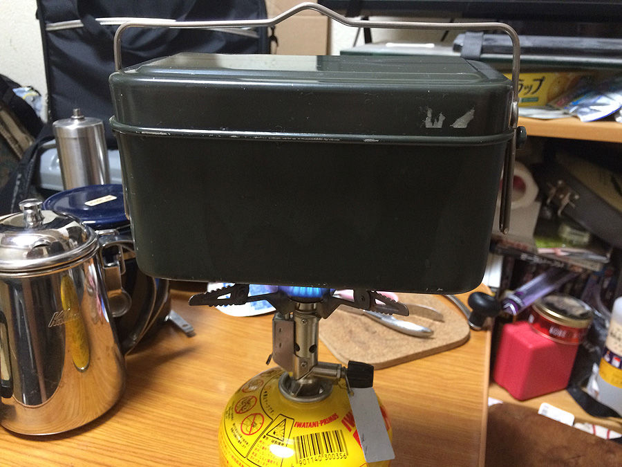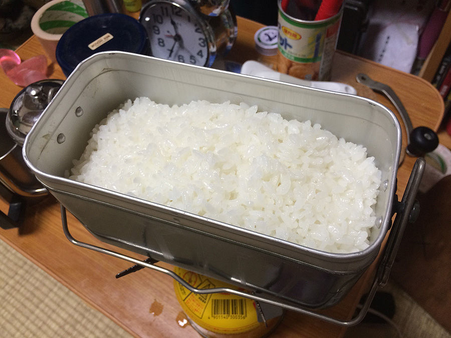さて、早速飯を炊いてみたのですが、火力自在なガスバーナーであれば、上手に炊けます。ただし、火力の強いガソリンストーブや、火力が一定のアルコールストーブだと、鍋の高さが低く吃水も浅いので吹きこぼれが凄いかもしれません。ガスだとその点は上手い具合に調整できます。何にしても、ポータブルストーブを使う分には良いと思ったのですが、もしもこれが焚き火などの直火だと、少々やり難いのではないか、と思いました。というのは、吊り金が短く、必然的につり下げる道具なり機具も低くせざるを得ず、かつ横長の箱ですので、兵式飯盒に比べると見るからに炊き難そうです。その点は、今の自衛隊の戦闘飯盒II型に相通ずるものがあります(戦闘飯盒II型も食器としての用途がメインです)