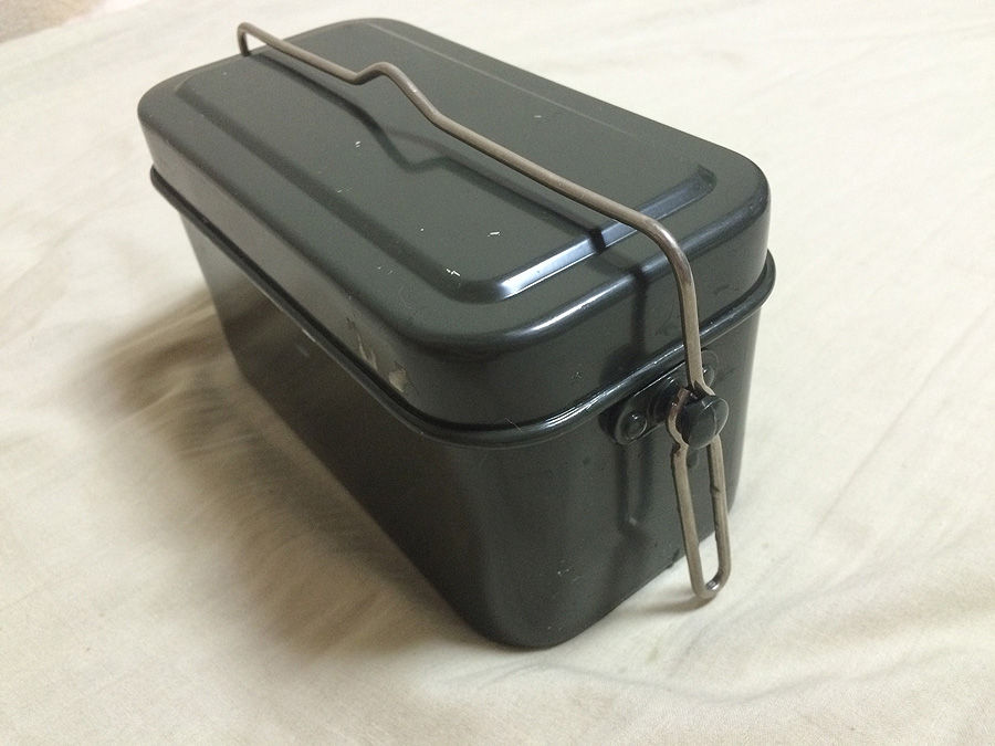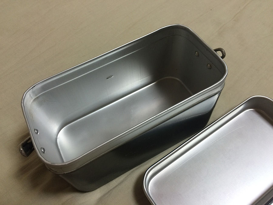 この箱形の飯盒、空豆形の兵式飯盒より容量も少ないし、箱形だけにザックへのパッキングもし易いので、