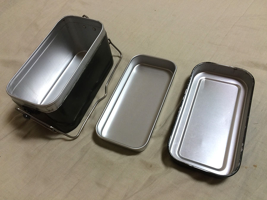 この将校用飯盒も、結構長い間、兵式飯盒同様に登山具店などで売られてた様ですが、今では完全に廃れてしまいました。思うに、兵式飯盒はライスクッカーとして極めて巧妙かつ精巧に作ってありますが、将校用飯盒は「やれば出来る」程度の炊飯能力ですし、食器兼クッカーとしてなら最近はもっと使い勝手が良い物が沢山ありますので、廃れるのも仕方ないと思います。