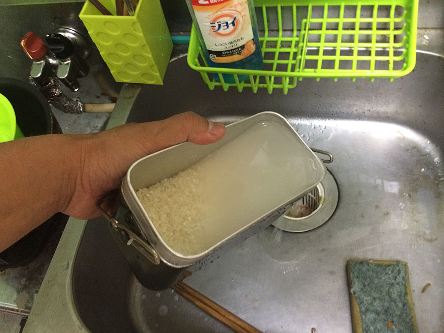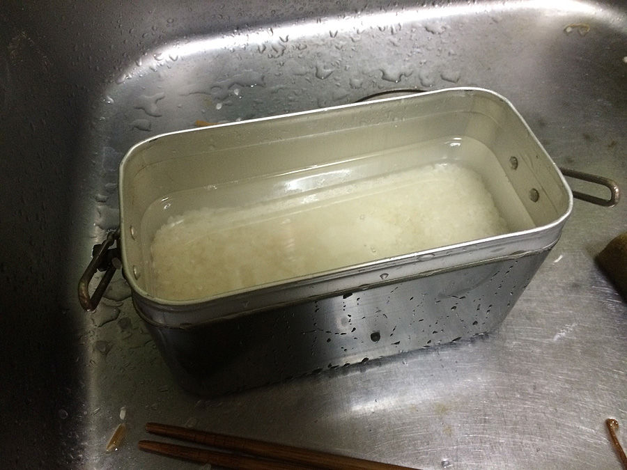 先ほど、この飯盒の飯の炊ける量は2合と言った訳ですが、ではその2合をどうやって測るのか。兵式飯盒では中子に擦り切り一杯が2合で掛子だと3合だったのですが、将校飯盒で試してみたら、中子すり切り一杯は約290ml、2合には少々足りません。そこで掛子で試してみると、丁度2合でした。蓋類が計量カップの代わりになっているとは思ったのですが、中子はオカズ入れとしての役割しかないようです(あるいは、ダイエットモード用の分量か?)この飯盒には水量線が一つだけありますが、一つしかないのは、2合炊きのみの前提であって、1合炊きは想定してない、という事だろうと思います。まぁ、やってやれない事はないでしょうが、浅く広くになるのでやり難そうです。その意味では、同じ2合でも兵式飯盒の方が全然炊き易いイメージです。飯を炊くにあたっては、水入れて米を研ぐ訳ですが、底が浅いだけにそろそろと洗わねばならず、ちょっと面倒くさかったです。