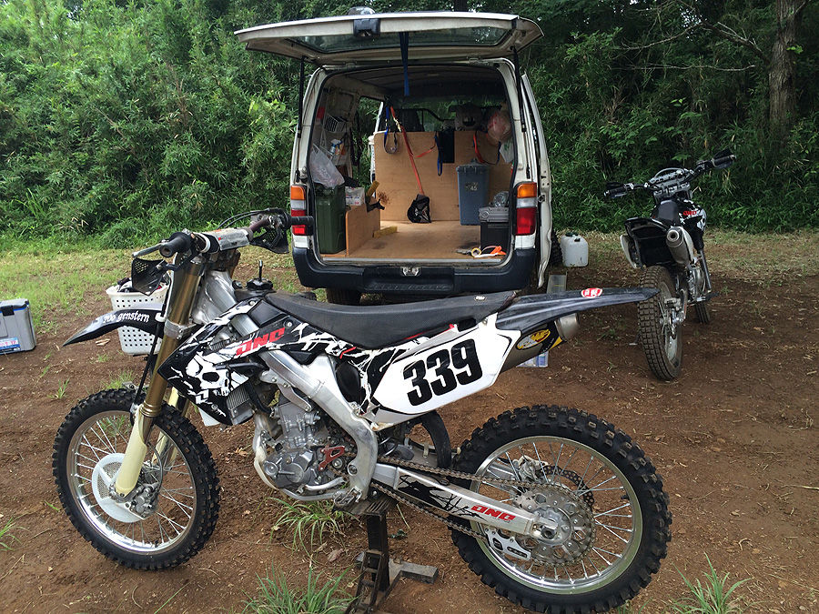 このあと、WR250Rにも乗らせて貰いました。WR250Rは前にも試乗した事があるのですが、もともと2人乗り用の為か、リアサスがとても硬いのが特徴です。今回乗らせて貰ったのは、サスのダンパー調整は圧側も伸び側も最弱、フロントスプロケを1丁落としたタイプでした。乗ってみた感想は、やはりサスは硬くてリアが跳ね上げられ、いくらリアを抑える乗り方をしても、抑えきれませんでした。そうかといって、サスが沈み込む訳でもなく、沈まないから反動で上がってくるという感じでもなく、という感じで、とりあえずソフトサスに換えようよ、といったところでした。パワーは結構強めで、前に出よう感が強いエンジンなのですが、ギア比の問題なのか、低速で粘らず高速で伸びる感じで、コースで走るにはちょっと扱いにくいなぁ、と感じました。このバイクは、自走で参加した人のバイクで、公道走るのも念頭においたセッティングにしている様でした。まぁ、低速で粘る様なセッティングにすると、公道ではメチャ遅になりますので、これはやむを得ないところです。
