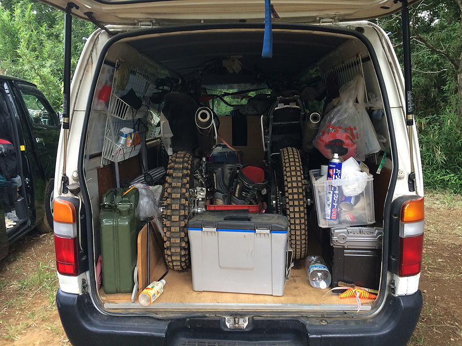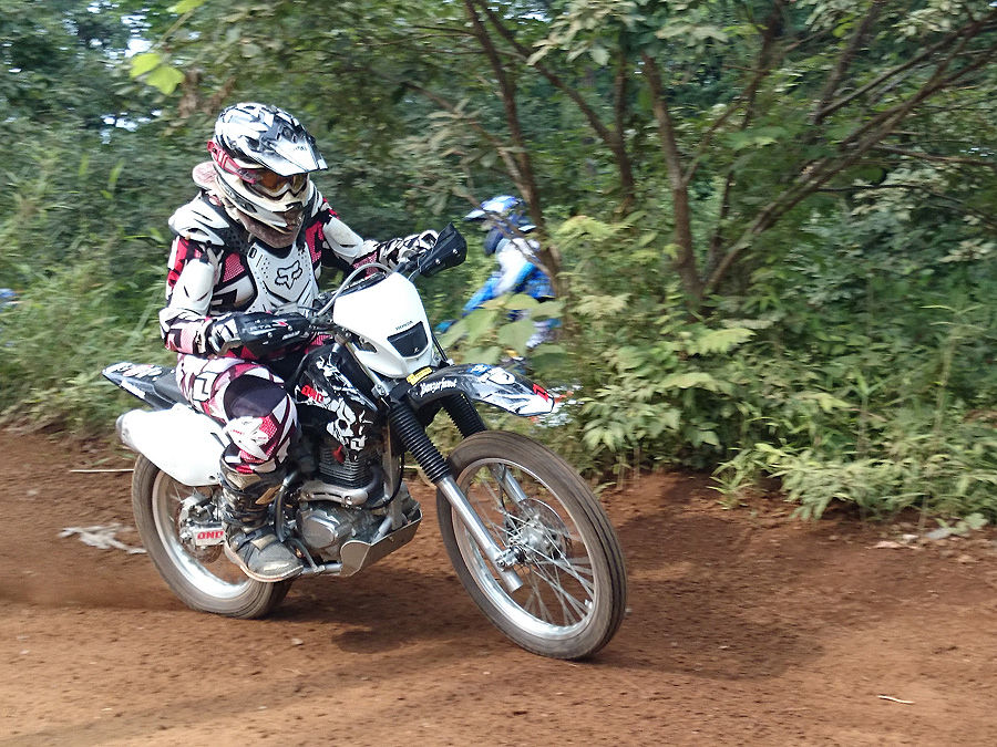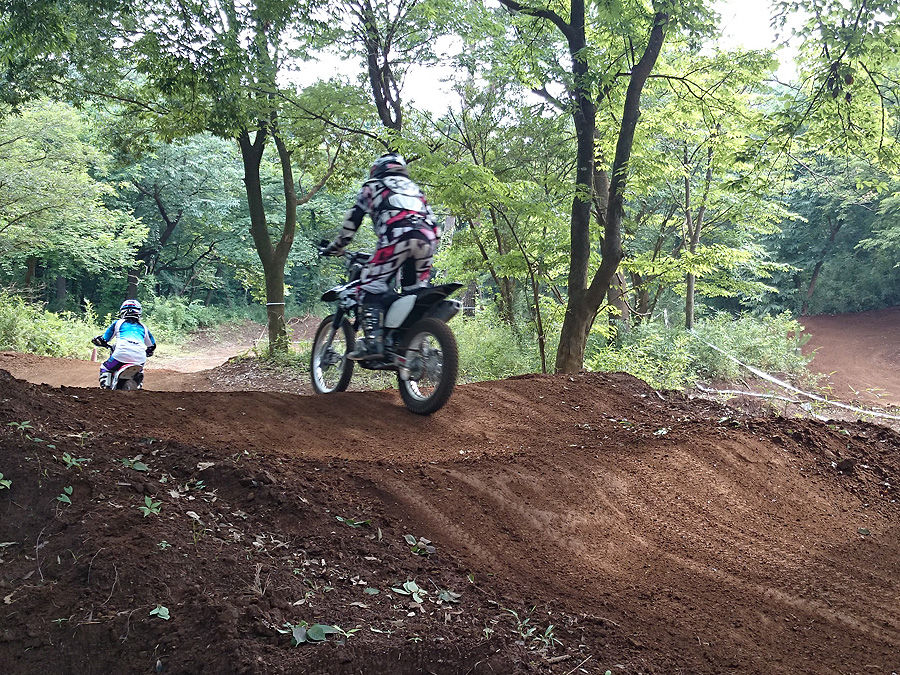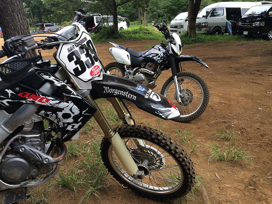 今日は初めてオフロードコースを走るって人も来ていたので、(身体しんどいから、これ幸いに)エスコートさせて貰いました。初心者コースに行くという事だったので、トランポから下ろしていたXR230“パンツァーファウスト号”を急遽準備。といっても、タイヤに空気入れただけなのですが、それに颯爽と跨がって初級コースに向かいました。……やっぱり、XRは乗り易いんです。乗ってて楽しいんです。確かにパワーはないけど、とてもマイルドで、かつピックアップも良くなって、もっとアクセル開けようかって気になるんです。確かにサスが弱くて、ちょっと飛んだら着地がガツンと来るんです(でも、飛べるのが凄い)。でも、どんな風に走っても、地面のガタガタがダイレクトに手や腕にくる感じがなくて、もっとチャレンジしようって気になるんです。旋回性の良さは、トライアル車を除いて、他のいかなるオフロードバイクよりも凌駕していると思います。こんな小回りの効くバイク、そうそうありません。