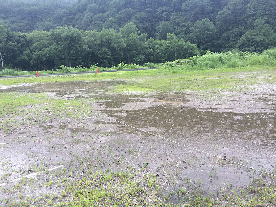 そんな訳で、現地には0730時頃到着。気になる雨はずっと降っている感じで、パドックのそこここに大きな水たまりが出来てました。今回、こんなに早く出て来たのは、なんと総勢12台分のトランポをまとめて駐車させるスペースを確保する必要があったからでした。早いもの勝ちなので朝駆けでやってきたのですが、同じ事を考える人はいるもんで、既に何台もの参加者が場所取りしてました。しかし、雨が降ってる間はトランポからバイク下ろす気にもならず、さりとて他にする事もなく、だからといって寝てる訳にもいかず、ダラダラと喋ってるうちに雨が上がったり小雨になりました。やる気のある人は、セクションスクールに行ったりしてましたが、バイク汚したくない自分は、バイク下ろして準備するだけにしました。まぁ、事前に乗ろうが乗らまいが、本番では大した差はありません。むしろ、コースを見に行った方がよほど身になる事が多い訳です。