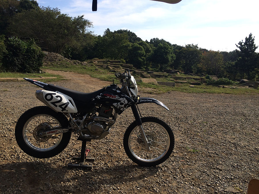 朝0830時頃に現地到着。この時間だとまだ誰も来てないのですが、今日は昼には帰らなければならないので、さっさとバイク下ろして準備です。とはいえ、前回もそんなに乗ってないし、砂埃など全然立ってないし、エアクリーナーもまだまだ持つでしょう。という訳で、給油して、タイヤの空気圧だけで足して、さっそくウォーミングアップに8の字やりました。先週来た時は、どうにも身体が固く、ガクガクした回り方になっていたのですが、今週は金曜日の夜にきっついグループセンタジーをやったせいか、先週よりは柔らかく背中を使う事が出来る感じでした。「背中」というか、具体的に肩甲骨周りなのですが、そこを動かす事でバランス軸を動かして、身体を捻って曲がって行く訳です。腕を動かしてハンドル操作で曲がっている訳ではありません。