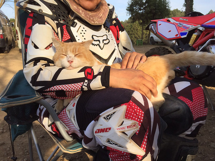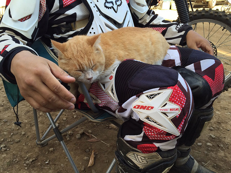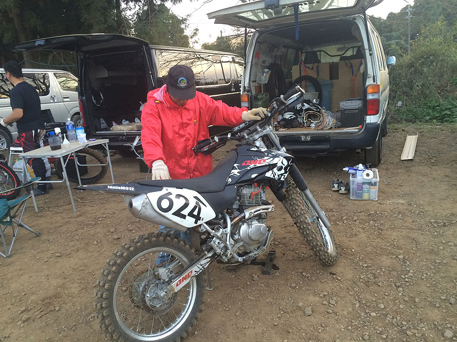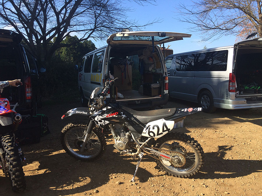 ところが、デコボコランドがクローズしてから、借地を拡張して、オトロしいMXコースとは別にエンデューロコースを作ってるとの事。そして、旧デコボコランドのライダー達が喜んで出向いている、という話しでした。今回自分は初めて行ったのですが、パドックの入口付近はもともとそこでモトクロスやってた人たち、パドックの奥の方が新設されたエンデューロコース走る人たち、という感じになっていました。コースの入口に近いところから停めて行くと、そういう感じになるようです。