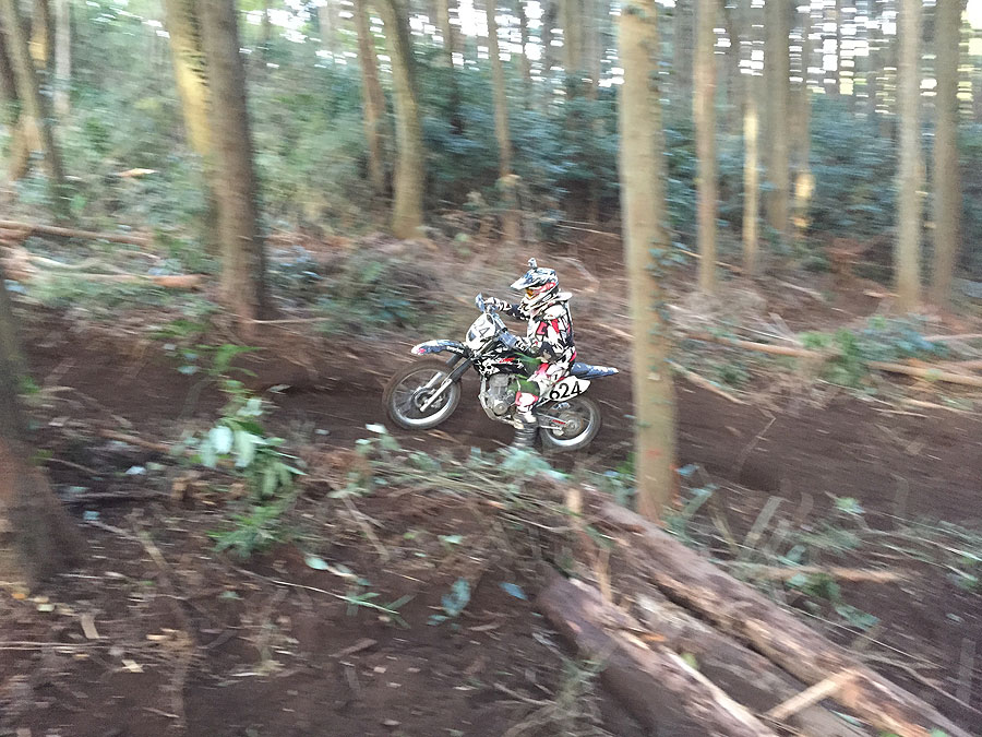 エンデューロコースは、練習用MXコースから分岐して、森の中に入って行く形で作られていました。木々の間を走る感じは、デコボコランドのウッズの雰囲気そのものでした。しばらくして、猛烈な激下りに辿り着いたのですが、そこはかなり危ないらしく、右に分岐が作ってありました。しかし、そこもまだ整備されきってないらしく、二人して「え?ここでええの?」「いや、自分も分らんす」みたいな感じでした。いずれにしても、かなり急な下り坂でしかも、進入がタイトターンであるだけでなくキャンバーで、とてもじゃないがバイクに乗ったまま降りれない、という感じでした。