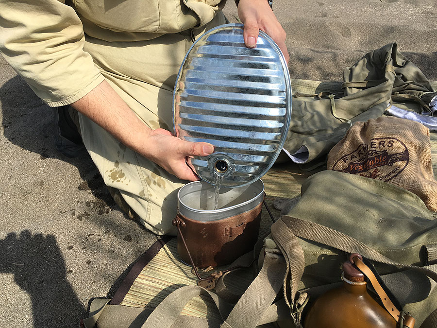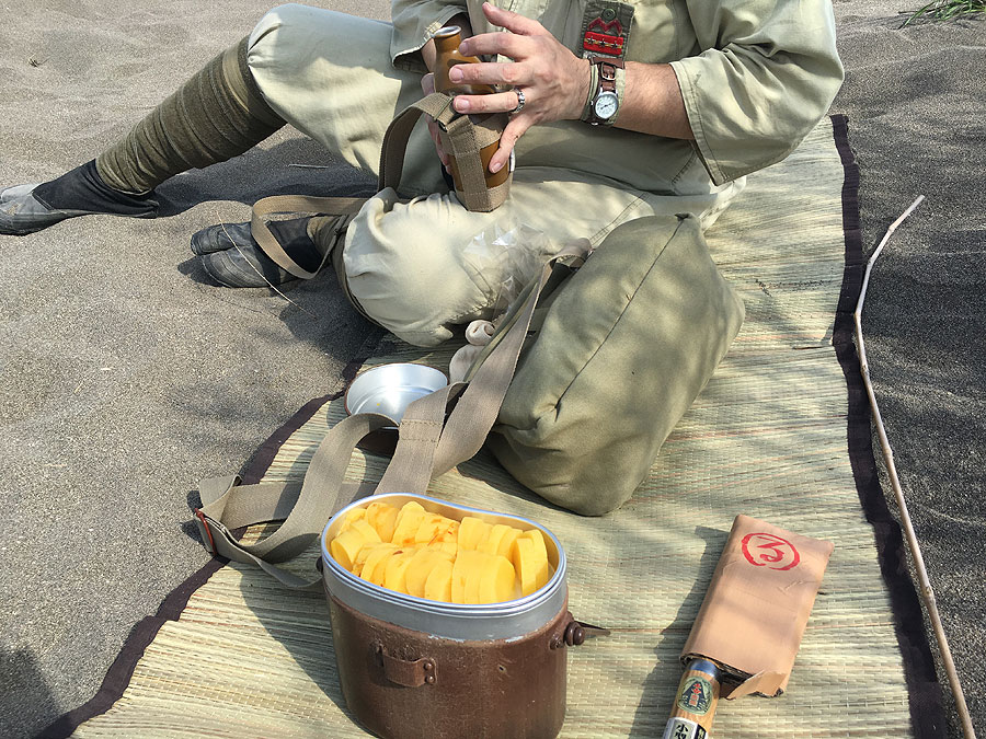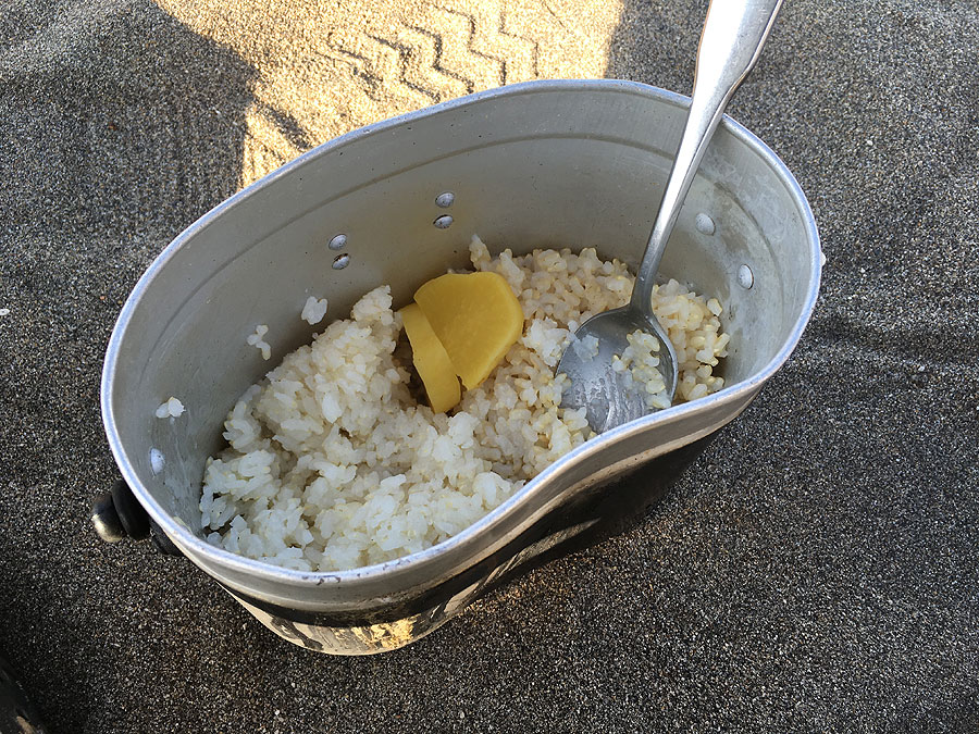 今回、さらに感じた事は、セロファン筒で飯を炊いたあと、お残しするならセロファン筒のまま残せ、かつ飯盒は一切汚れない、というメリットを発見しました。現地で飯盒を洗うというのは、結構手間でありますし、水があまりない所では実質無理ですので、洗わずに済むというのは、戦地においても大メリットであったと思います。
