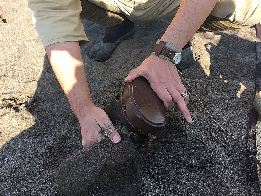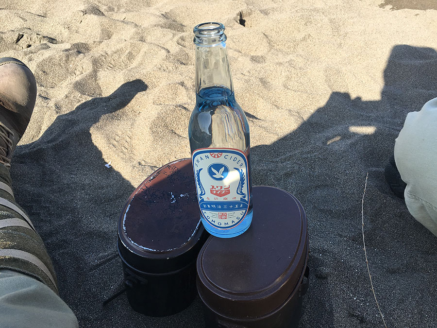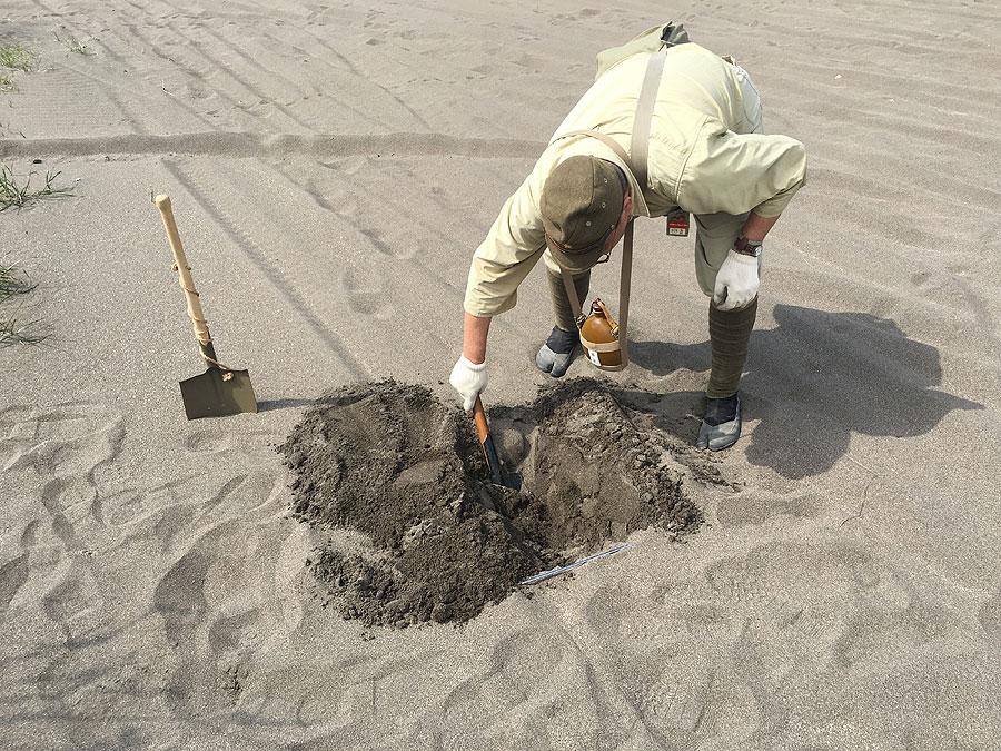 現地に着いてみると、陽が登って汗ばむ陽気に。相方のToyofusaさんは防暑襦袢で登場。そういや、この人が夏衣袴着てるとこ、見た事がありません。取手の河川敷は、今回が3回目ですが、今回は焚き火を使うため、橋の下でなく、もっと川っぺり移動しました。行ってみて驚いたのは、一面の砂浜です。聞けば、ここではヒストリカルゲームがよく開催される場所とか。どこでやりますかって聞かれましたが、どこを向いても砂浜なので、適当な所で荷物おろして、早速準備に取り掛かりました。今回、焚き火をやるにあって、旧陸軍のマニュアルを参考に、まずは炊飯壕を掘りました。やっとこ小円匙の活躍が与えられた訳ですが、中田商店のレプリカの小円匙は、実は焼き入れがされてないとかで、うっかり地面を掘ったら、曲がったり削れたりする代物です。そんな訳で、地面掘るための道具で地面掘るのがためらわれてたのですが、地面がザクザクの砂地ですから、安心して使えました。