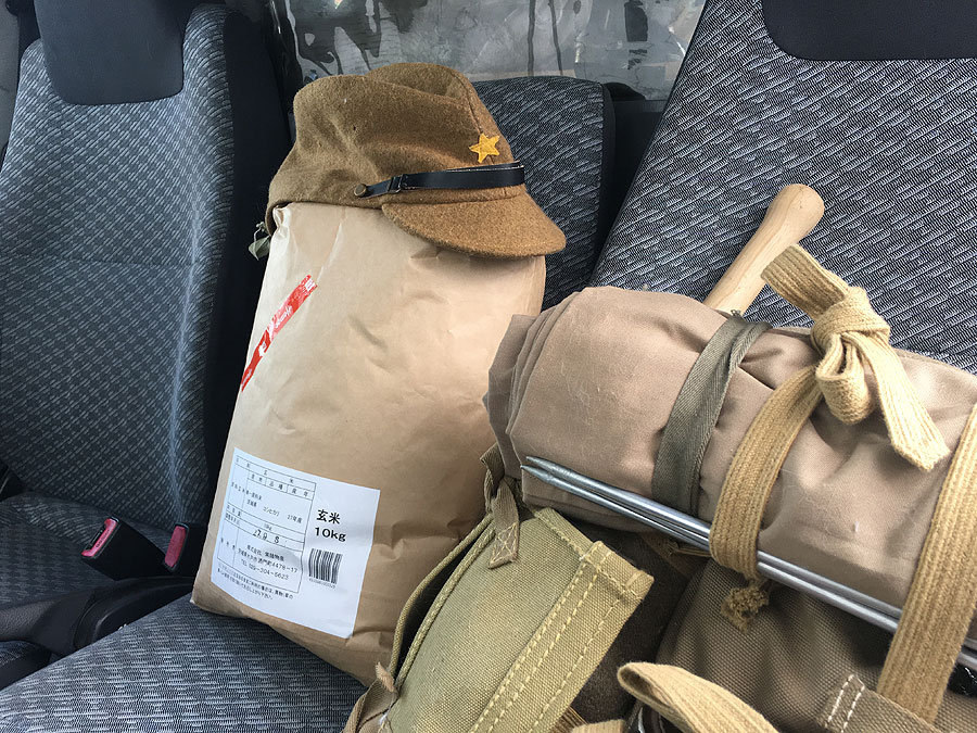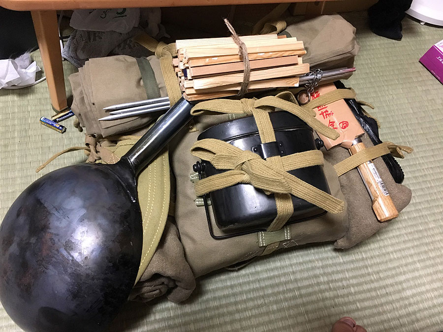 今回、自分が用意するのは、玄米2合と中華鍋、そして炊飯壕を掘る為の円匙ですが、今回は一応、日本兵の格好で行きますので、背嚢を準備しました。といっても、この背嚢、実際に使うのは飯盒と円匙を縛着する為だけに必要なもので、周りに巻いてる毛布や携帯天幕は、格好だけに着けてるだけです。でも、それらを着ける為には、背嚢本体がパンパンに物が入っていないとフニャフニャで形が作れないので、いつもは乾パンや精米など、これまた使わない携帯口糧を入れたりします。つまり、要らんもんばっかり持って行く必要があるのです。まぁ、基本的な装備は予め集合して保管してあるので、準備そのものは手間が掛からないのですが、今回は金曜夜のグループセンタジーがキツくて(今年始めの2か月休んだため)、家に帰って来たら正体もなく寝てしまい、夜中に目が覚めて慌てて準備する羽目に。ともあれ、持って行っても無駄な携帯口糧は下ろして、代わりに雑嚢を突っ込んで背嚢の形を整えたのですが、問題は中華鍋。いつもなら飯盒の上に被せる様に鉄帽をつけるのですが、それの代わりに中華鍋を着けようと思っていたのですが、縛着の仕方で良い案が思い浮かばない。もう眠たいんで、中華鍋は手で持って行く事に。