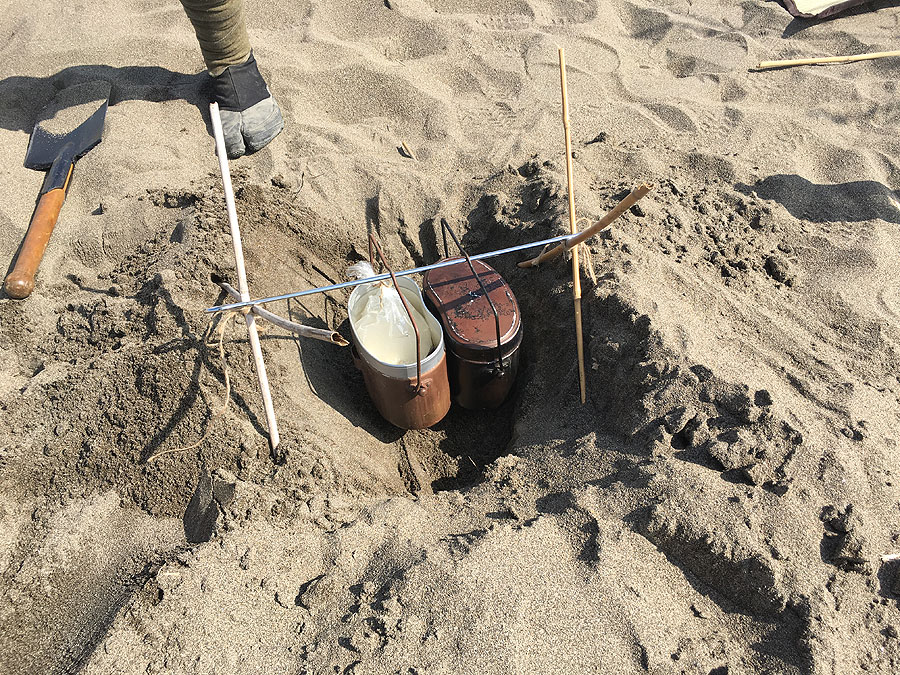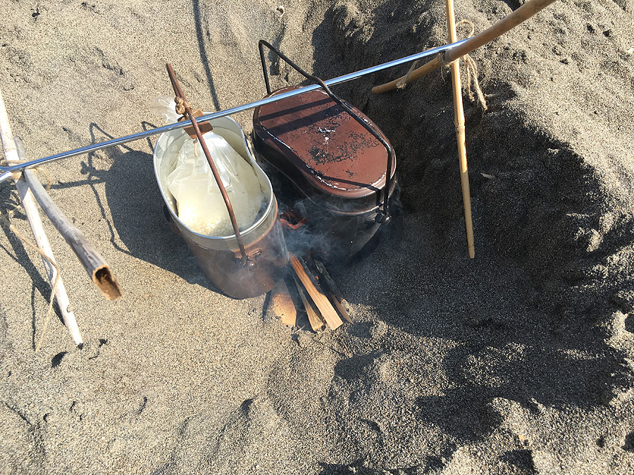 問題は、砂地故に、掘っても崩れ易い事でした。川っぺりだけに、10cmも掘れば、砂が湿っているのですが、露出すれば乾いてくるので、やっぱり崩れてくるのです。ともあれ、30cmほどの深さに掘って、飯盒2個分下げれる幅に調整しなおし、飯盒を掛ける棒を支える支柱は、そこらに落ちてた細い竹を縛ってこさえ、さっそく炊飯に取り掛かりました。