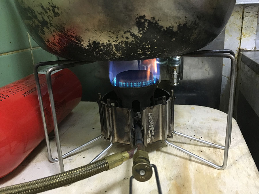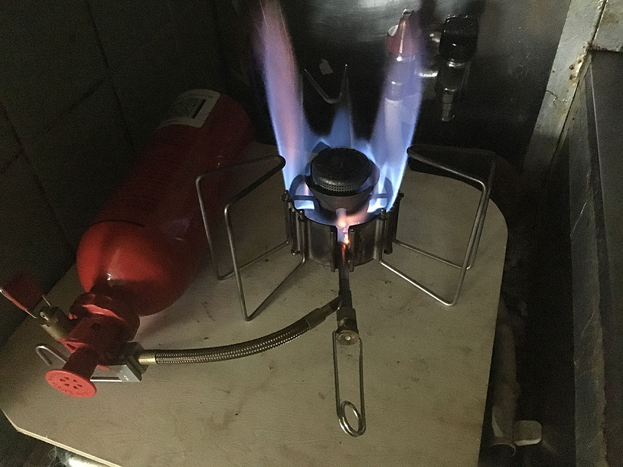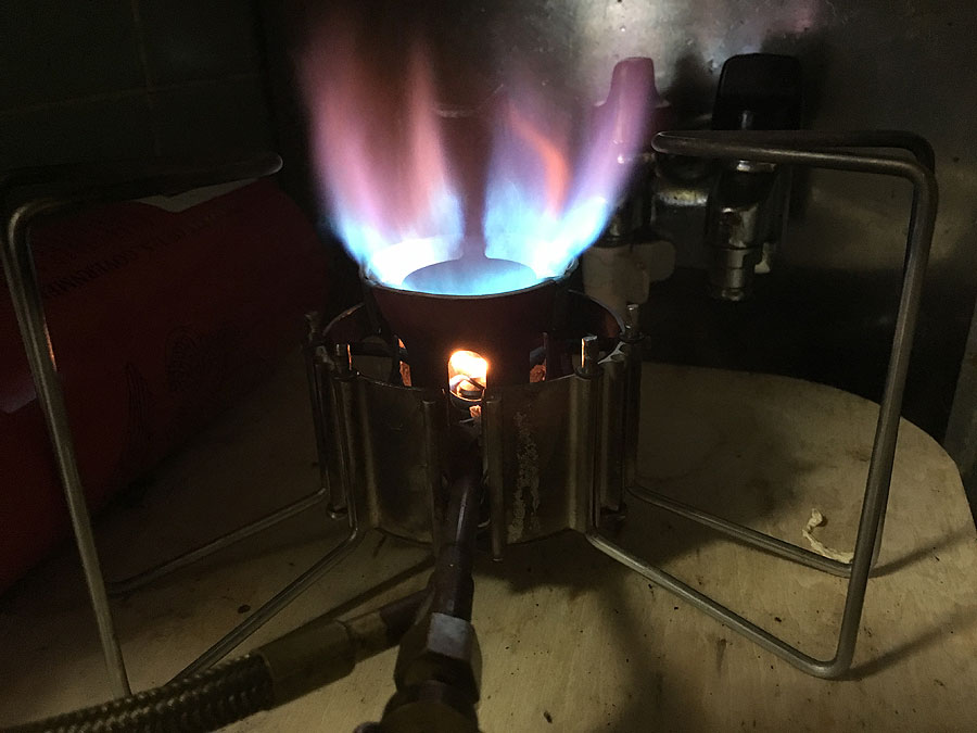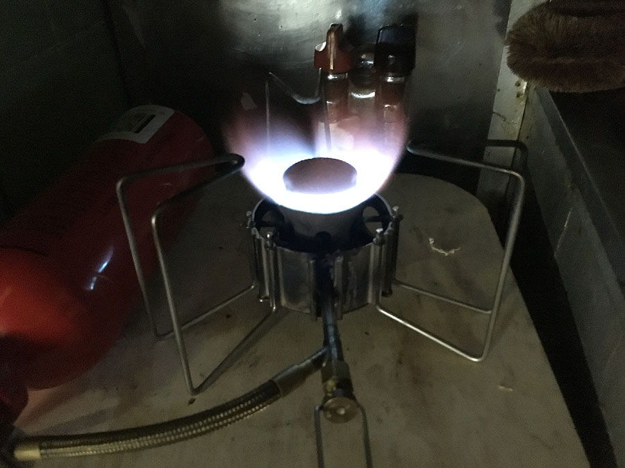 最後に、新品のジェットを付け、再々度点火。すると、あまり元気が良くなく、明らかにプレヒート不足の様相。でも、プレヒートはしっかりやっています。そこで一旦消火して、バーナー部を上下に振って、内蔵されているクリーニングニードルでジェットの穴を掃除。改めて点火したとろこ、バーナーヘッドがやや冷えたのか、赤爆しつつではありましたが、いつもの様に元気よく燃える様になりました。
