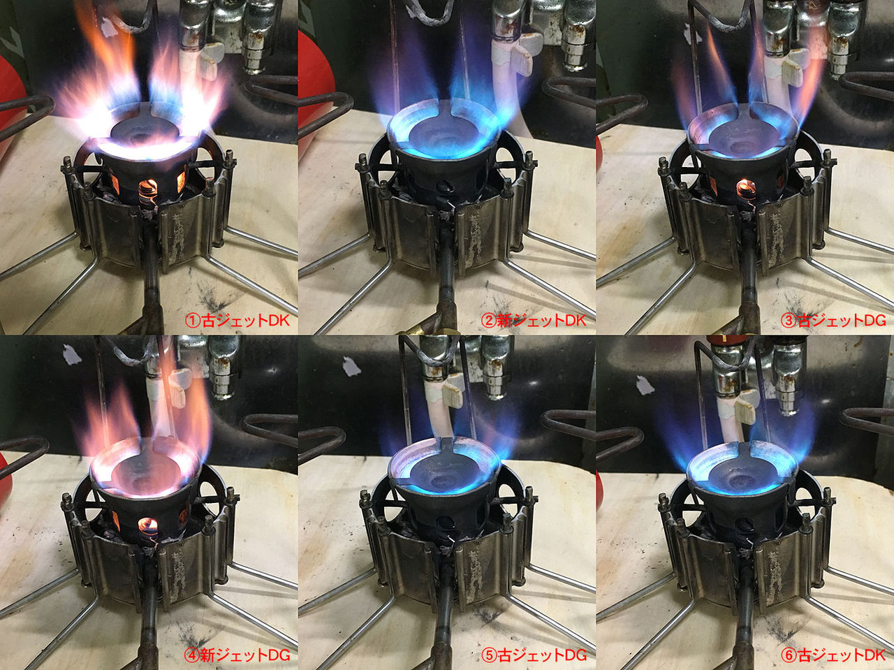 そこで、原因を究明するために、改めてテストしてみました。テストは灯油とガソリンのジェットの古い物と新しい物を、ニードルの古い物と新しい物で、それぞれ組み合わせて、一つずつ燃焼状態を確かめ、出来不出来を見る事で、傾向を確かめてみよう、というものでした。結果は、この様な感じでした。