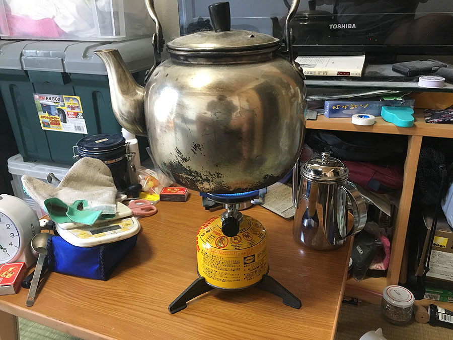また、火力比においても、カセットガスジュニアバーナーは2,300kcal/hに対して、IP-2243は3,600kcal/hと圧倒しており、普段の湯沸かしで使う場合でも、カタログ上ではIP-2243の方が早く沸く事になります。かつ、そうそう使うものでもなく、ガスがしょっちゅう無くなる訳でもない事から、「どこでも手に入るカセットガス」である必要もなく、IP-2243も複数になったので、交代させる事にしました。
