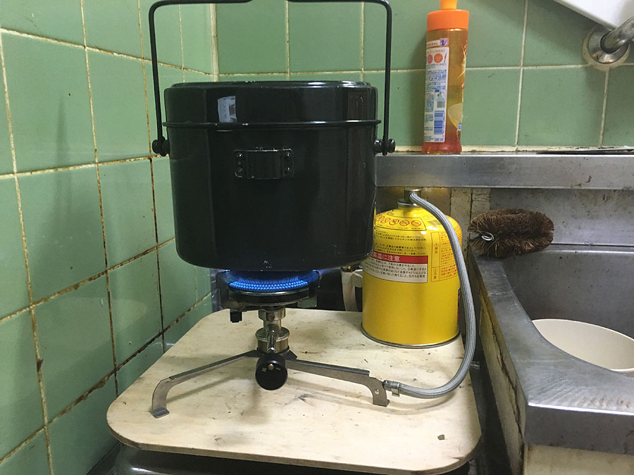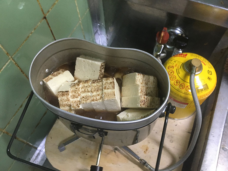 水、調味料、玉ねぎを飯盒に入れて火にかけます