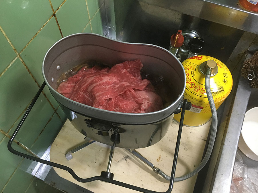 初めて作った牛丼の感想は、とにかく簡単、そしてあまり失敗は無さそう、という事でした。そして、これって、忙しい車中泊での副食に向いているじゃないか、と思いました。一番最初の割り下なんか、水に調味料入れて、玉ねぎ入れて、それから煮るだけです。なんなら、砂糖、醤油、みりん、酒、おろし生姜を予め自宅でミックスしておいて、現地でそのまま使っても良さそうなもんです。玉ねぎは現地で向いて適当に切れば良いし、肉は冷凍しておいて、現地で仮にまだ解け切ってなくても、焼くのでなく煮るので、少々凍ってても、まぁ大丈夫です。